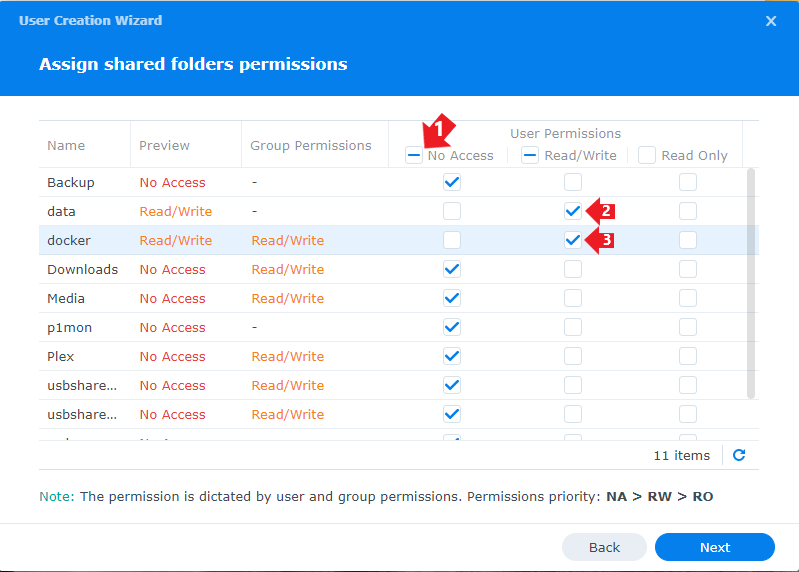 Now only select Read/Write on the shares docker and data (the share we created earlier).