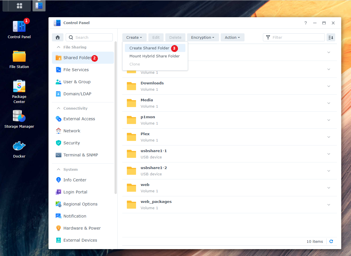 Control Panel > Shared Folder > click Create > choose Create Shared Folder