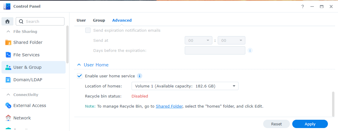 To enable Home folders, go to Control Panel > User & Group > Advanced > Enable user home service at the bottom.