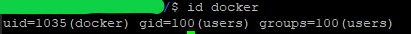 For the Docker container to access the shares on Synology, we need to know the user ID (PUID) and group ID (PGID) from the docker user we just created.