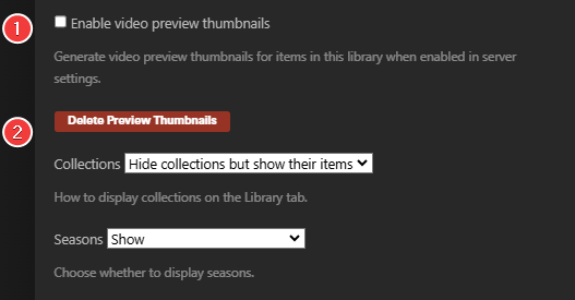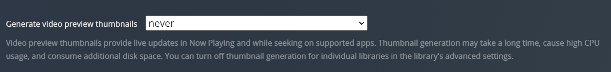 This option creates a series of preview thumbnails from a media item when it is analyzed. These images are used by some Plex apps when you move back and forward in an app with the timeline scrubber. They’ll also be displayed in Now Playing when someone is streaming from you so that you can see where they are in the video.