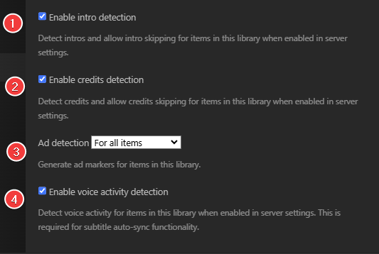 Generate intro detection for items in this library when enabled in server settings.
