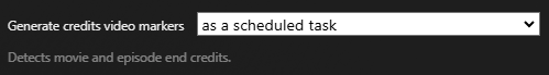 Credits markers can be generated locally and/or retrieved via an online database. Online markers may not always exist, if this preference is set to 'both' then any locally detected markers are submitted anonymously back to the online database for future use.