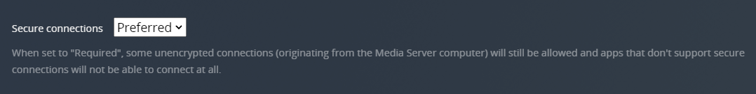Accept and prefer secure connections when they’re available for a Plex app, but allow regular HTTP connections if the app doesn’t support secure connections or if one can’t be established